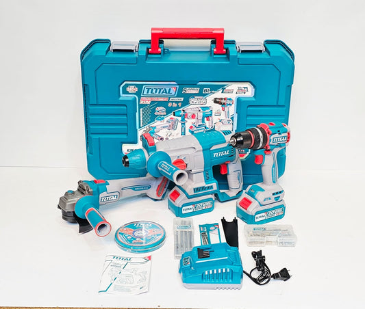 TOTAL COMBO INALAMBRICO 20V TALADRO ATORNILLADOR + PISTOLA DE IMPACTO + ROTOMARTILLO + 2 BATERIAS 5.0AH + 1 CARGADOR Y ACCESORIOS UTCKLI20638